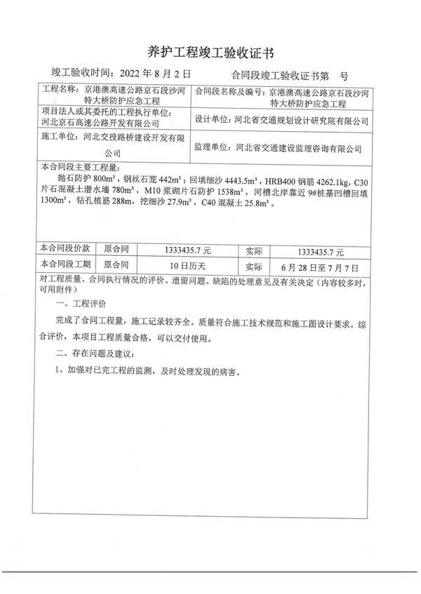 沙河特大橋樁基防護應(yīng)急工程驗收證書